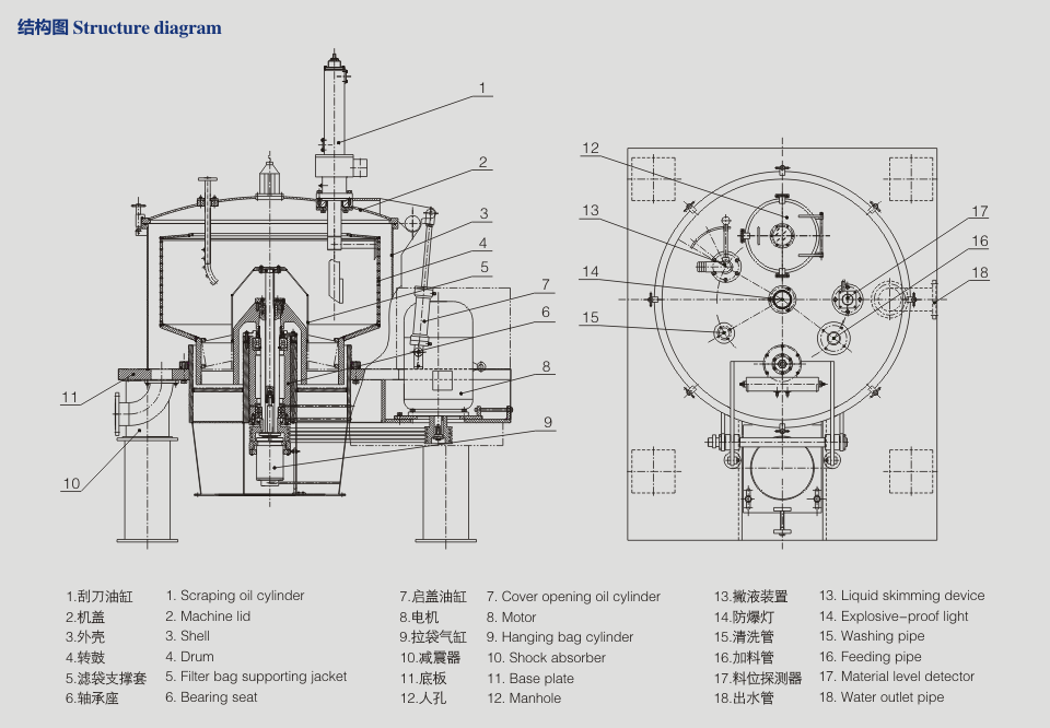 卸料過程進行時,刮刀動作,在刮刀的作用下,大部分物料通過轉(zhuǎn)鼓底部的落料孔排至機外,殘余料層通過轉(zhuǎn)鼓內(nèi)部的自動拉袋機構(gòu),產(chǎn)生振蕩效果,將殘余料層清除。