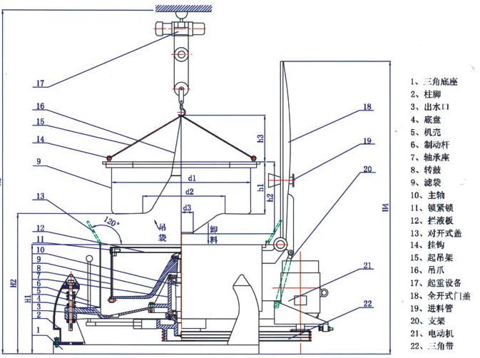 電動(dòng)機(jī)帶動(dòng)轉(zhuǎn)鼓旋轉(zhuǎn),物料由頂部進(jìn)料管加入轉(zhuǎn)鼓,在離心力作用下趨向轉(zhuǎn)鼓,其中液相穿過(guò)濾布和鼓壁濾孔排出。固相截留在轉(zhuǎn)鼓內(nèi),停機(jī)后啟開(kāi)機(jī)蓋松開(kāi)攔液板鎖緊銷(xiāo),用起吊裝置將攔液板連同裝有濾渣的濾袋一并吊往卸料處,松開(kāi)特制的吊爪使濾袋一端開(kāi)口張開(kāi),濾餅便自動(dòng)落下。