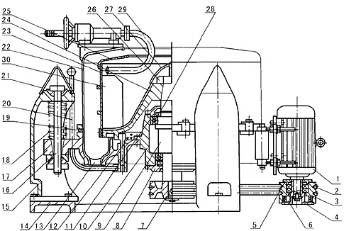 電動機通過離合器帶動轉(zhuǎn)鼓高速旋轉(zhuǎn),物料由上部加入無孔轉(zhuǎn)鼓,在離心力作用下物料中的輕重相開始分層,重相緊貼轉(zhuǎn)鼓壁,輕相形成內(nèi)層液環(huán),該澄清液可翻過攔液板溢流出轉(zhuǎn)鼓,也可用撇液管在運轉(zhuǎn)中引出轉(zhuǎn)鼓,固相則在停機后由人工從轉(zhuǎn)鼓中卸除。