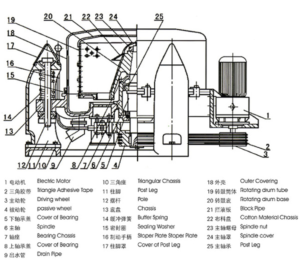 調(diào)速電動機帶動轉(zhuǎn)鼓旋轉(zhuǎn),調(diào)節(jié)轉(zhuǎn)速至中速,物料由上部加入轉(zhuǎn)鼓經(jīng)布料盤均勻灑布到轉(zhuǎn)鼓壁,升至高速,在離心力作用下,液相穿過濾布和鼓壁排出,固相截留在轉(zhuǎn)鼓內(nèi),停機后由人工鏟除或抖動濾袋,使固相松散后從下部排出。