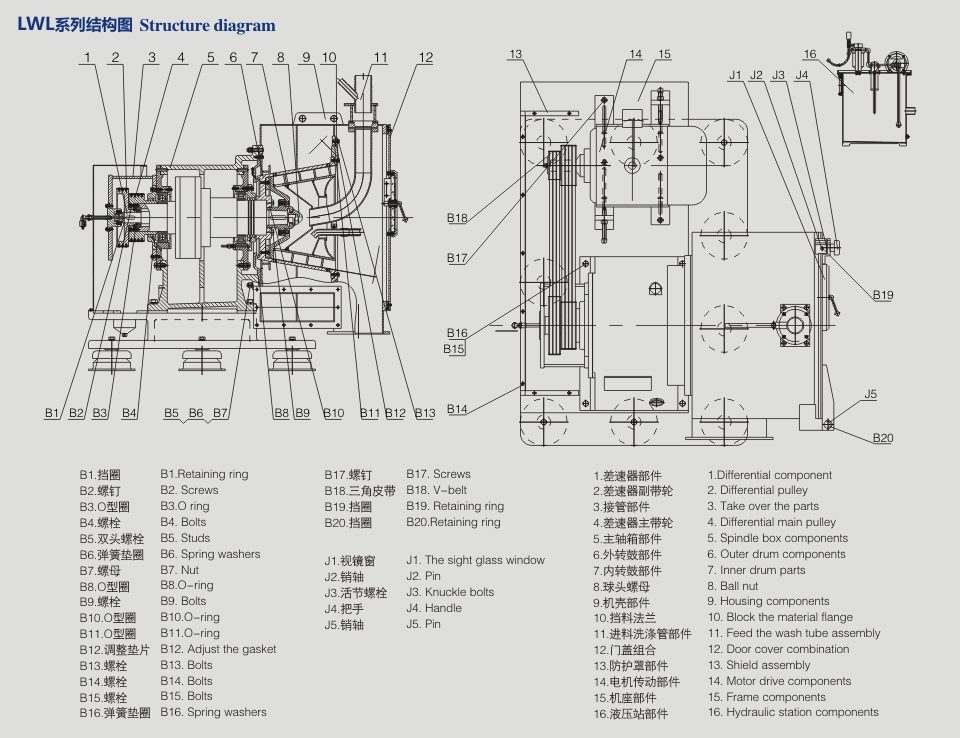 LWL型離心機(jī)是一種臥式螺旋卸料、連續(xù)操作的過濾設(shè)備。轉(zhuǎn)鼓與螺旋以一定差速同向高速旋轉(zhuǎn),物料由進(jìn)料管連續(xù)引入輸料旋內(nèi)筒,加速后進(jìn)入轉(zhuǎn)鼓,在離心力場作用下,液相穿過過濾介質(zhì)排出機(jī)外,固相物截留在轉(zhuǎn)鼓內(nèi)形成濾渣,濾渣在離心力的錐面分力和輸料螺旋的共同作用下,連續(xù)不斷地向轉(zhuǎn)鼓大端移動(dòng)排出轉(zhuǎn)鼓,經(jīng)卸料槽排出機(jī)外。本機(jī)能在全速運(yùn)轉(zhuǎn)下連續(xù)進(jìn)料、分離、洗滌和卸料。具有結(jié)構(gòu)緊湊、體積小、連續(xù)操作、運(yùn)轉(zhuǎn)平穩(wěn)、適應(yīng)性強(qiáng)、處理量大、濾餅含濕率低等特點(diǎn)。