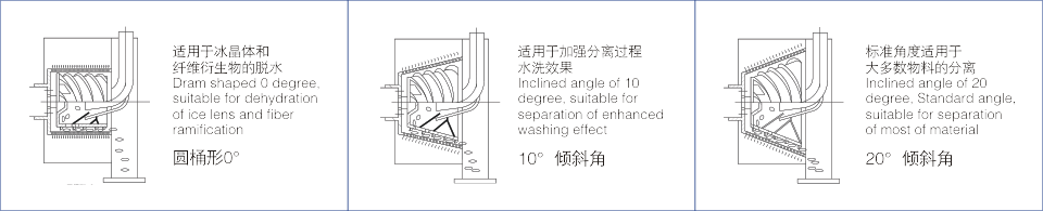 為了減少固態(tài)物的排放阻力,過濾筒有一定的傾斜角度(脫水角度)。利用傾斜角度和螺旋葉片,減少了固體排放阻力。不但極大的提高了其排放效率,而且具有耗電量低,處理量大的優(yōu)點(diǎn)。